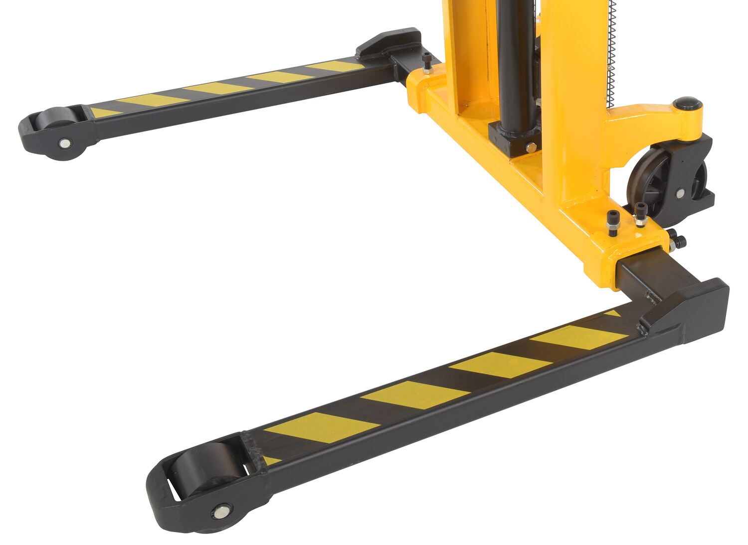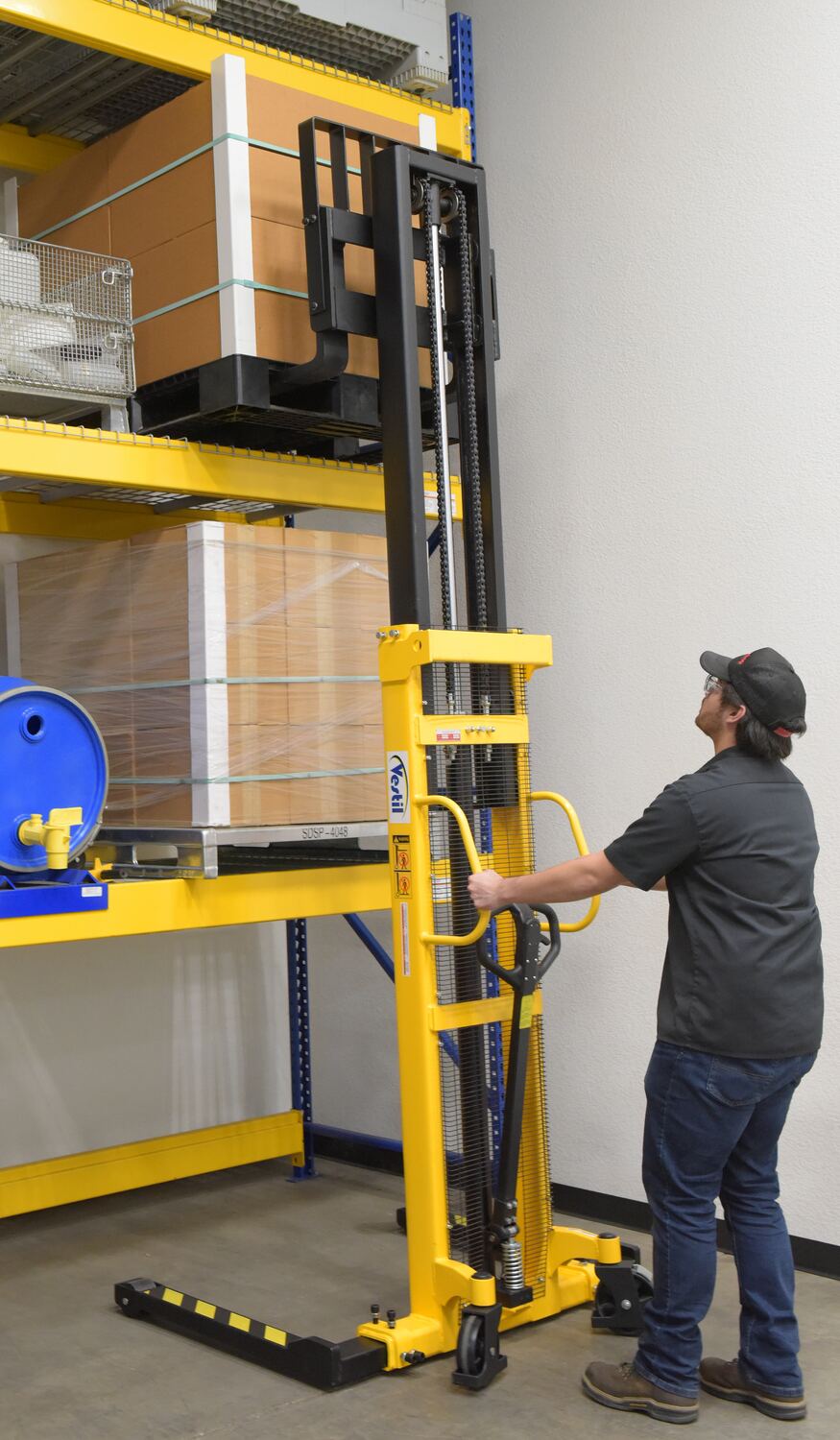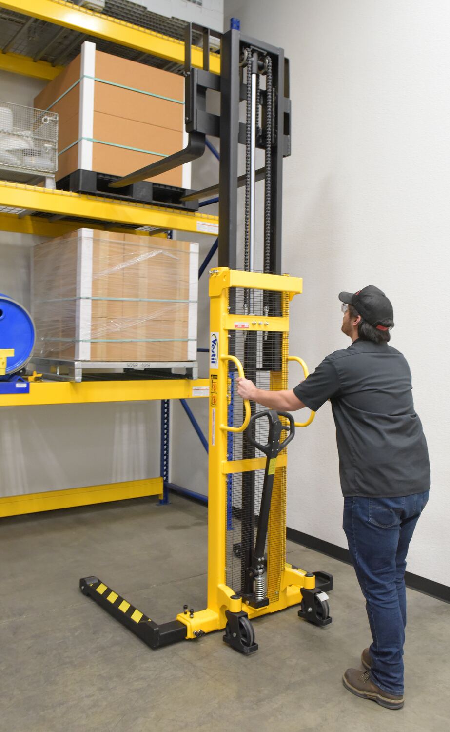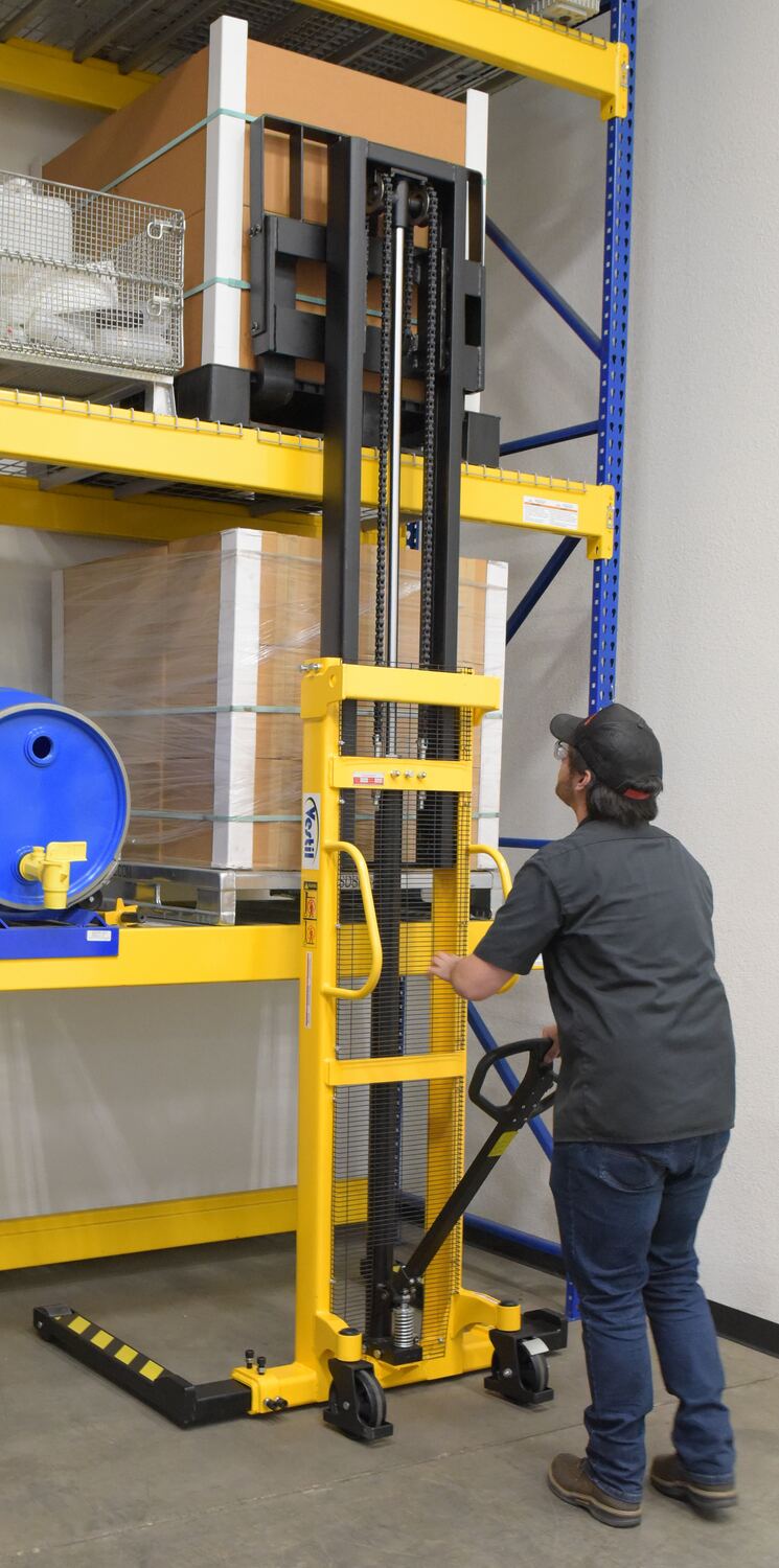 Steel Stacker Manual Pump 2 - 118 In. 1,500 - 2,000 Lb. Capacity Black / YellowManual Hydraulic hand pump stackers are sturdy and compact to fit through standard height doors. Forks are raised by manual hydraulic hand pump operation and released by a lever situated on the handle. 1" lift per handle pump. Two rigid and two swivel wheels standard.