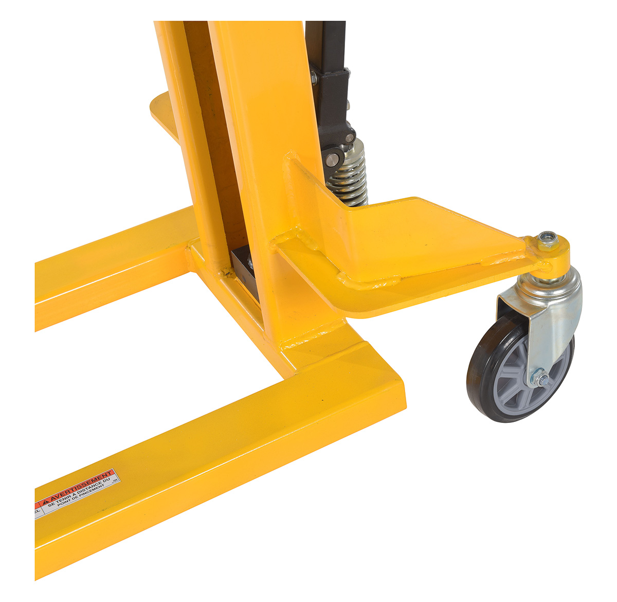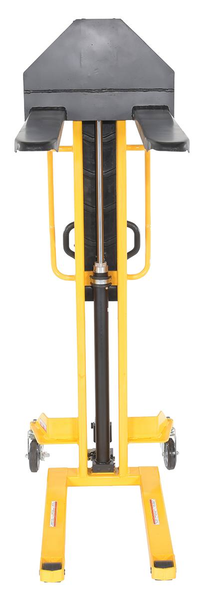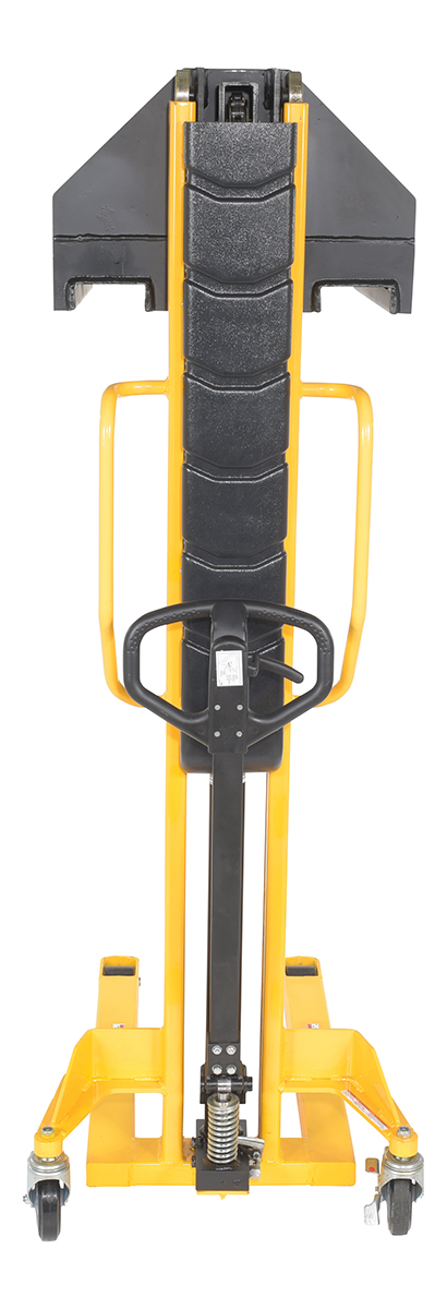 Steel Manual Stacker Narrow Mast Fixed Forks/Legs 1,000 Lb. Capacity Black / YellowSturdy and compact to fit through standard doors. Forks are raised by manual hydraulic hand pump operation and released by a lever situated on the handle. 1" lift per handle pump. Two rigid and two swivel wheels standard.