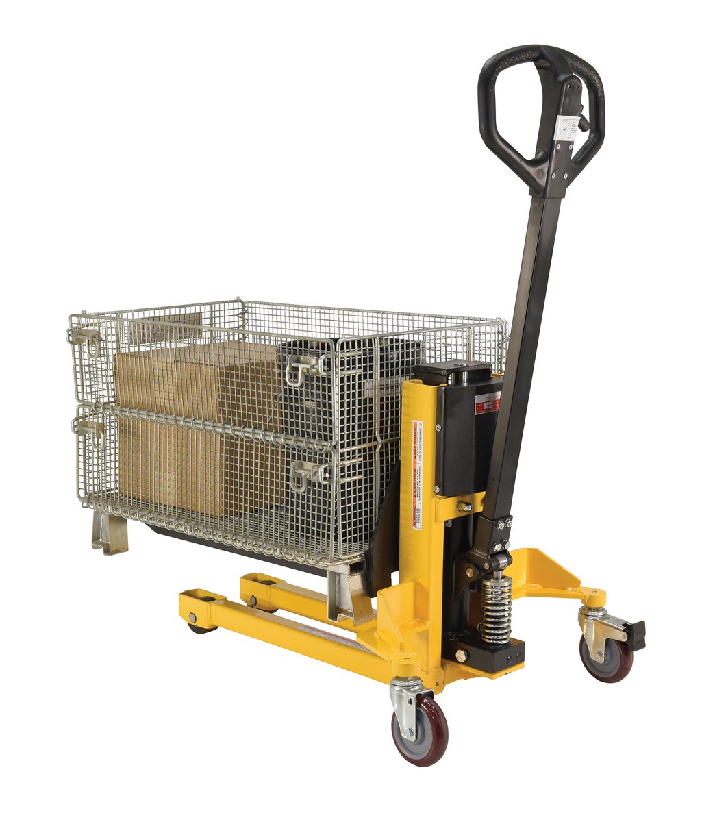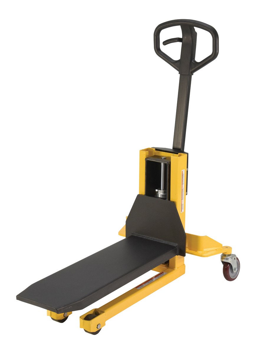Steel Single Fork Skid Positioner Lifter 800 Lb. Capacity Yellow / BlackA single fork skid positioner lifter is a new design of an old classic. Instead of the usual two skinny forks to lift open bottom skids, crates, and baskets this model has one large centered fork. The fork is open on 3 sides for easy loading and unloading of products. The high handle not only allows for steering, but as the pumping mechanism to raise and lower the height of the fork. Unit rolls on casters and includes a foot brake for secured positioning during transition periods. The compact design takes up minimal storage space, when not in use.