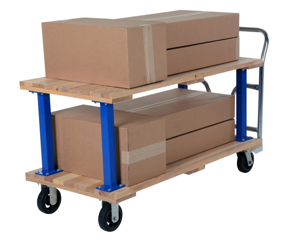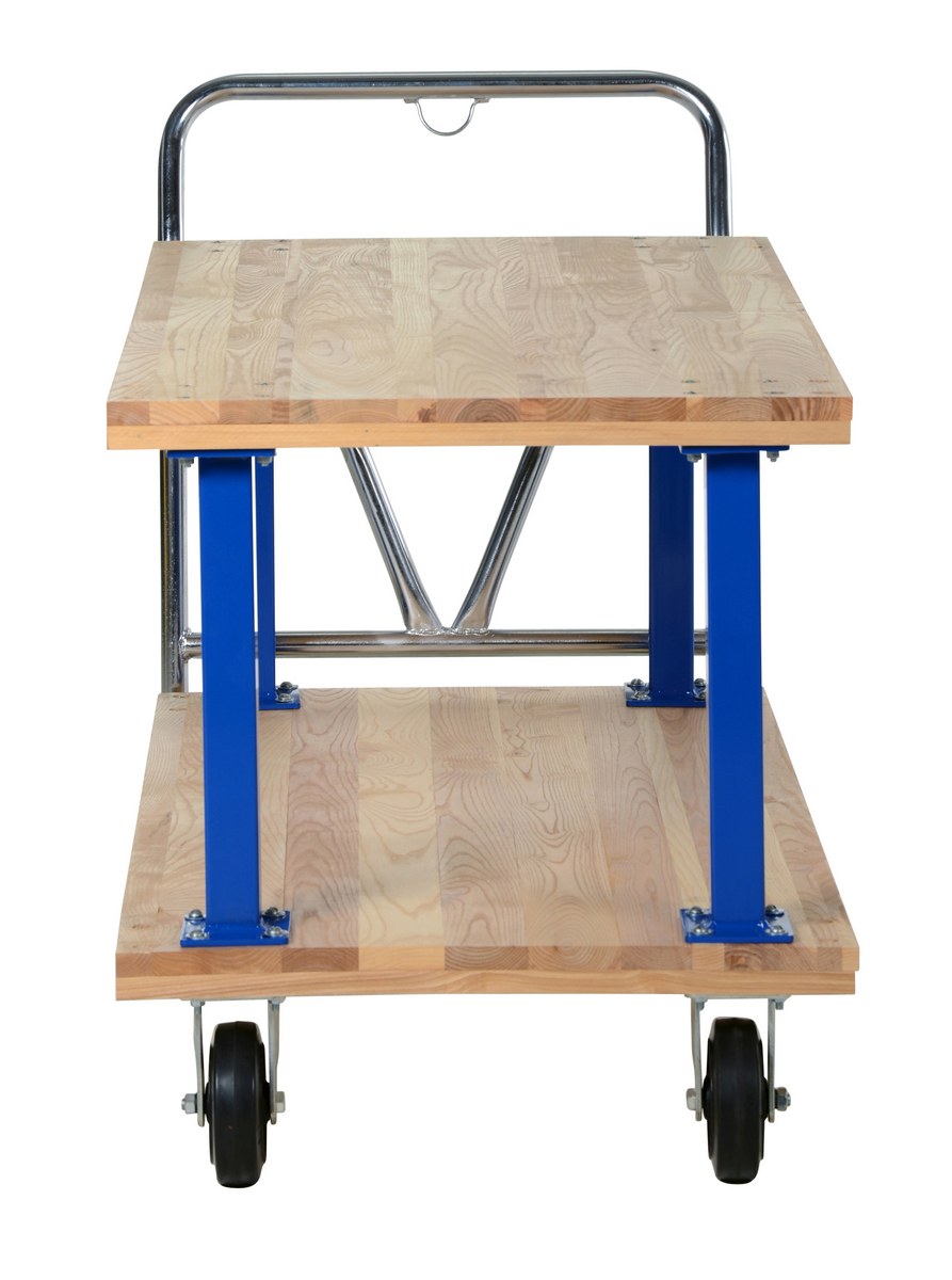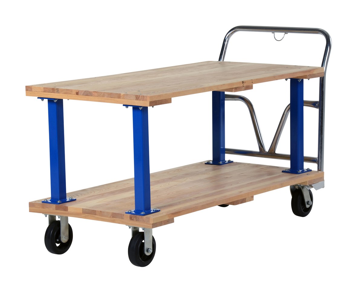Hardwood Double Deck Platform Cart 27 In x 54 In 1,600 Lb. Capacity TanMinimize lifting and bending with this double decker Hardwood platform cart/portable work bench. Ideal for shipping areas, offices, and plant use, these economical carts are perfect for many of your applications. Removable push handle is chrome plated. Countersunk holes allow for a smooth deck surface.