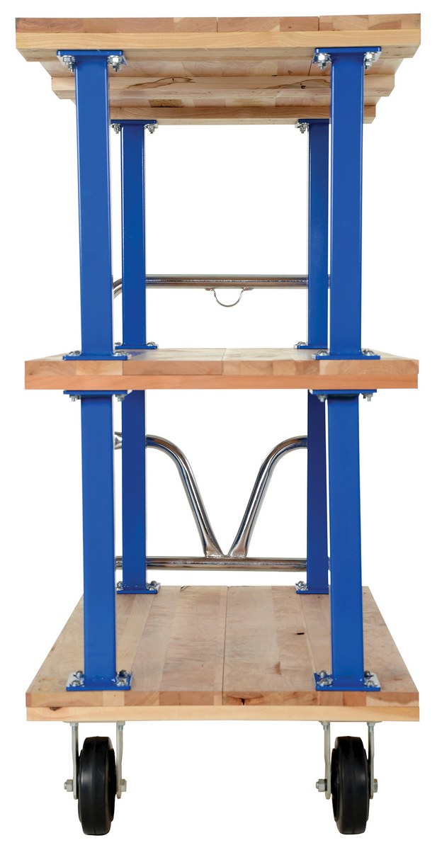 Minimize lifting and bending with this triple decker Hardwood platform cart/portable work bench. Ideal for shipping areas, offices, and plant use, this economical cart is perfect for many of your applications. Countersunk holes allow for a smooth deck surface.