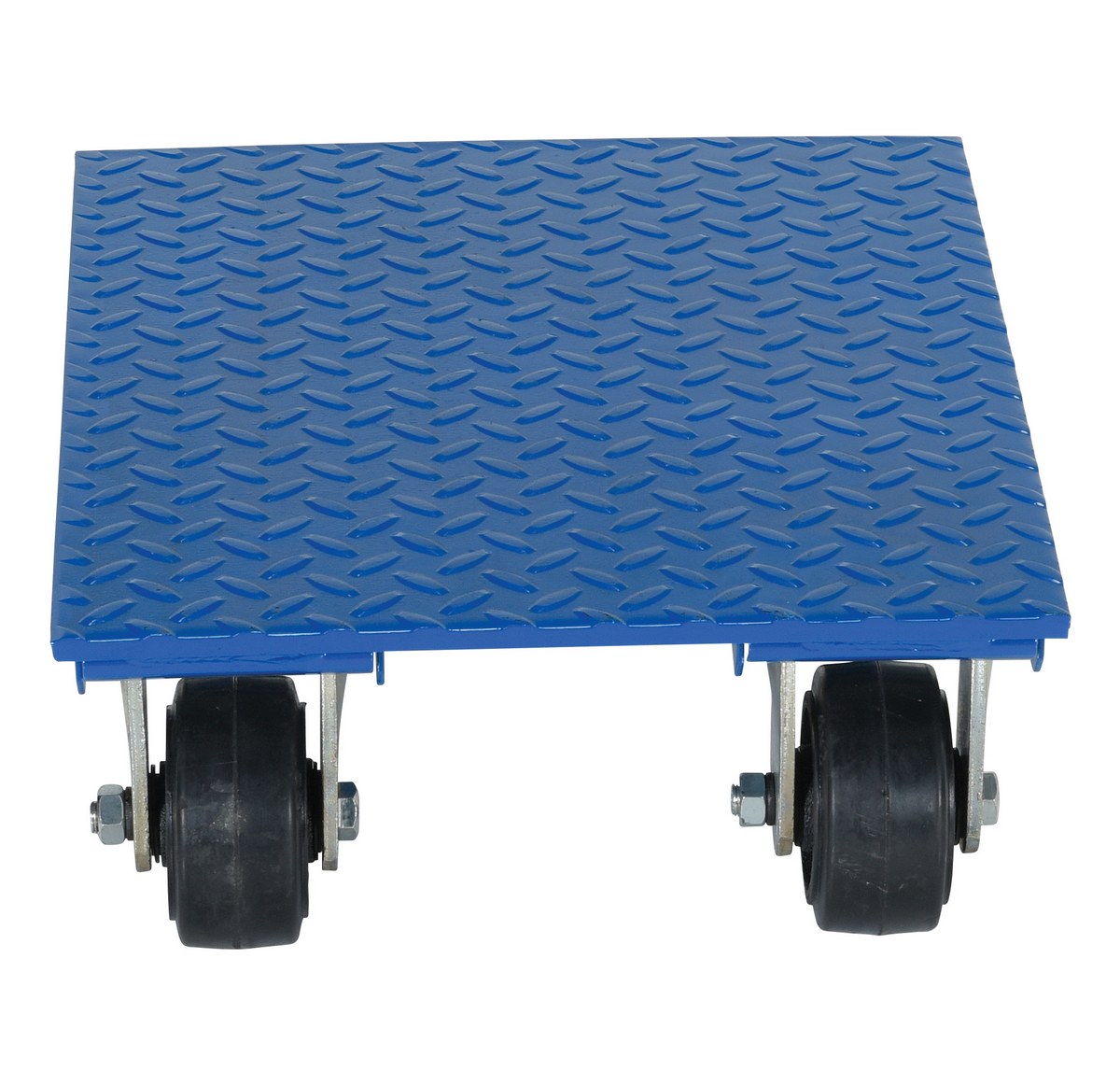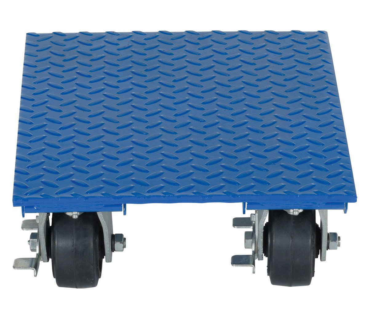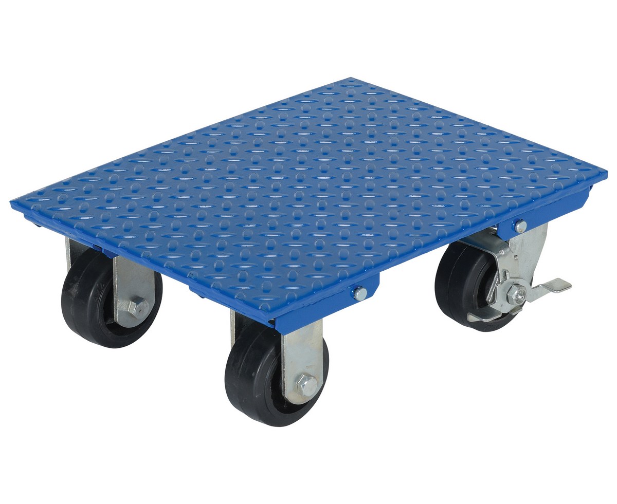 Steel Plate Dolly 14 In. x 18 In. 1,200 Lb. Capacity BlueThe steel plate dolly is ideal for distribution and material handling facilities. The plate dolly is constructed of diamond tread steel for durability and strength in the harshest of environments. The unit rolls smoothly on mold-on rubber casters, two rigid and two swivel with brake. Simply stack products onto the tread plate within the capacity rating and transport from workstation to workstation. Optional pull strap is available upon request.