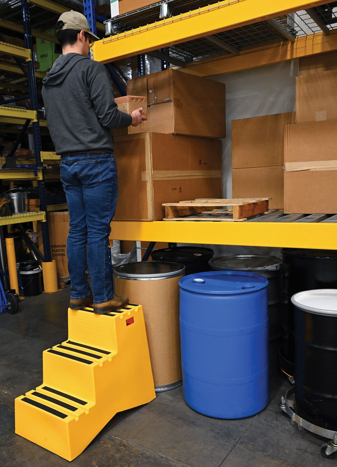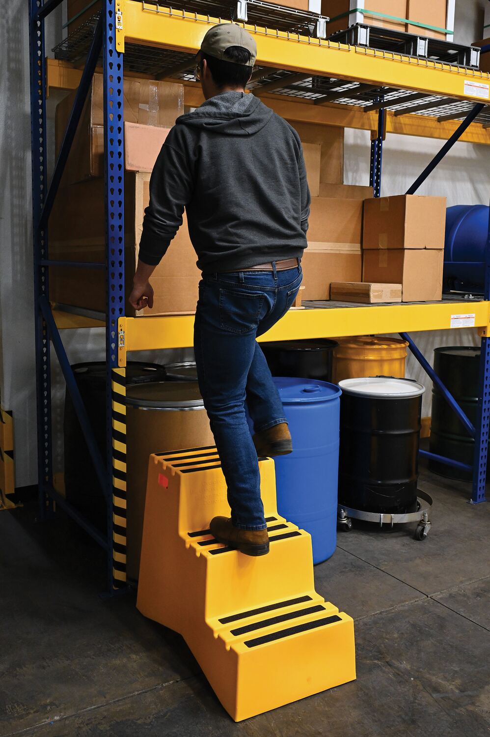 When items are out of reach, do not strain, simply step up with this Polyethylene step stool. The three (3) step unit has rear opening access storage compartments. This stool has rubber feet and a non-skid tape surface. Hand holes are standard for easy one person transportation.