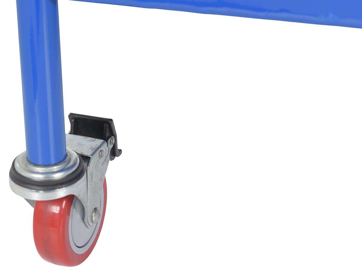 Steel Work Platform With Poly Casters, 2 Door Entry, and 84 In. Expanded Back 48 In. x 48 In. 1,000 Lb. Capacity BlueThis convenient fork truck work platform quickly and safely raises maintenance personnel where they are needed. Attaches to fork truck by inserting forks into fork pockets and securing platform to fork truck. Fork locks secure platform to forks. Expanded metal backing on fourth side. Includes checker floor plate platform and long strap with hook to attach platform to fork truck. A maximum of two (2) people can be in the work platform at one time. Meets California OSHA specifications.
