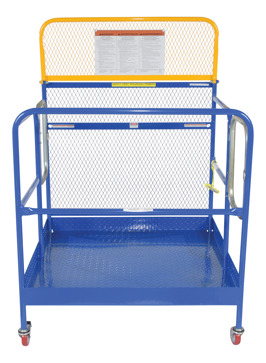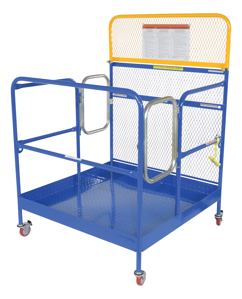 Steel Work Platform With Poly Casters and 2 Door Entry 48 In. x 48 In. 1,000 Lb. Capacity BlueThis convenient fork truck work platform quickly and safely raises maintenance personnel where they are needed. Attaches to fork truck by inserting forks into fork pockets and securing platform to fork truck. Fork locks secure platform to forks. Expanded metal backing on fourth side. Includes checker floor plate platform and long strap with hook to attach platform to fork truck. A maximum of two (2) people can be in the work platform at one time.
