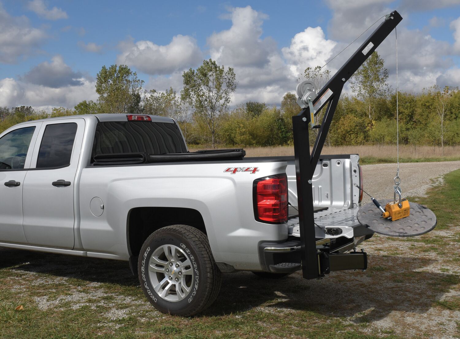 A hitch-mounted truck Jib crane with magnet easily mounts in standard class III or higher 2" receivers. The jib may be adjusted or leveled to best fit the setting and the users needs. Maximum uniform lifting capacity is 600 pounds. Manual hand brake winch with a lifting hook and 15 feet of cable is included. The industrial magnet includes a clevis for a simpler lifting and lowering process.